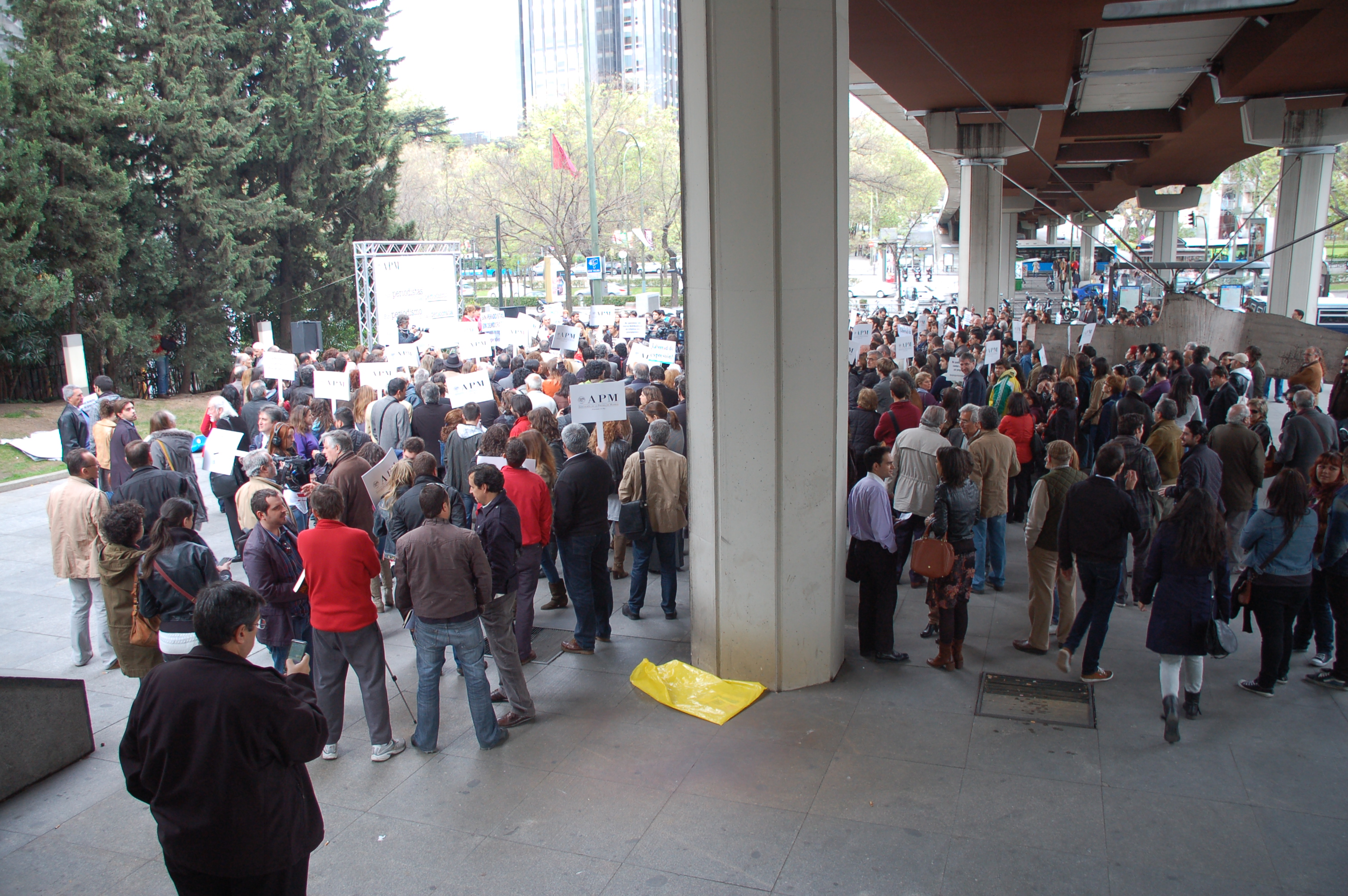 Bajo el puente que sobre la avenida de la Castellana, en Madrid, une la calle de Eduardo Dato con la de Juan Bravo, del que cuelga la sirena varada de Chillida, se han reunido, esta mañana a las doce,  con un tiempo fresco, con las nubes tapando el sol y acumulando lluvia, unas 200 personas para reivindicar eso. La mayoría periodistas. Apenas los ciudadanos nos hemos sumado a esta convocatoria, como si no nos fuera algo en ello. Algunos muy conocidos, como Iñaqui Gabilondo, Anabel Díez, Joaquín Estefanía, o Miguel Ángel Aguilar, y otros muchos cuyas caras no reconocemos, pero ocupan las redacciones y sin su concurso la información no nos llegaría. También había jóvenes, algunos de los que se podía deducir su reciente salida de las facultades de periodismo, o la experiencia incipiente haciendo “canutazos”, porque hoy los periodistas consagrados eran la noticia, eran los entrevistados, fotografiados y filmados por sus colegas más jóvenes.