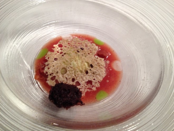 Le siguió el estofado de tripa de bacalao, con espuma de bacalao, sopa al aceite de oliva, escalonias con miel…