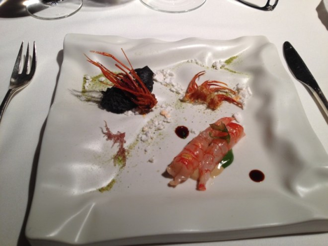 El primer plato donde aparecía algo entero que podía reconocerse de inmediato por su aspecto, fue el que traía dos gambitas de Palamós. Venían acompañadas de una cabeza aplastadita y unas patitas, listas para comerlas también, como al presentarla se nos indicó, pero los cuerpos estaban claramente poco cocidos, la textura era blandita y aunque de un bonito color rojizo, apenas habían perdido el aspecto traslúcido.  Las patitas y la cabeza resultaron estar suficientemente ásperas e insuficientemente sabrosas como para no invitar a proseguir con ellas tras el primer intento. En cambio los cuerpos, tal como sugería su aspecto, tenían la melosidad y el especial sabor del marisco casi crudo.