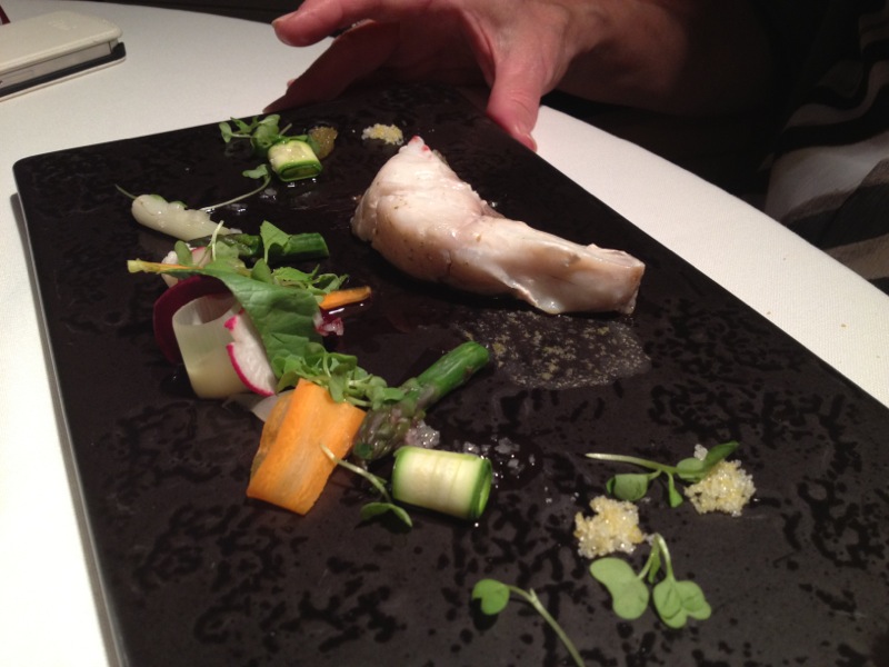 Luego apareció la tajadita de besugo “de peca” del golfo de Rosas, al parecer una variedad muy típica de la zona, con yuzu y alcaparras, que estaba tan crudo que había que esforzarse por despegar la carne de la piel. Como nada estaba muy caliente, no así algunos recipientes, yo me lo comí mientras mi acompañante devolvía el suyo para que le dieran un punto de cocción mayor, ya que no le sugería nada en esas condiciones. Cuando lo trajeron de nuevo, sólo un poco más hecho, lo encontró más apetecible y se lo comió.