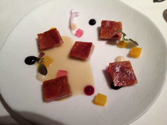 Después vino el cochinillo, en cuadraditos, que apetecía después del largo paso por el mar. Estaba agradable, pero adolecía de lo mismo que el resto de los platos, le faltaba ese sabor que impresiona nada más probarlo y hace brotar la saliva. Estaba todo tan atenuado o tan alambicado, rodeado por hojitas y daditos de gelatina y espumas y manchitas de salsa, y helados, a veces insípidos, o bien con sabores dulzones o con sabores concentrados que no encontrábamos especialmente logrados en el conjunto, que lo que verdaderamente yo estaba llegando a echar en falta a esas alturas era simplemente un par de escamas de sal, por ejemplo,  para colocar sobre aquel estupendo lomito de besugo que lo había precedido.