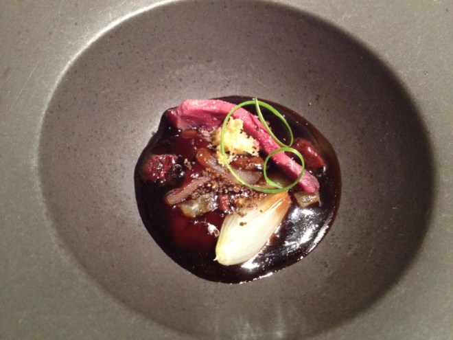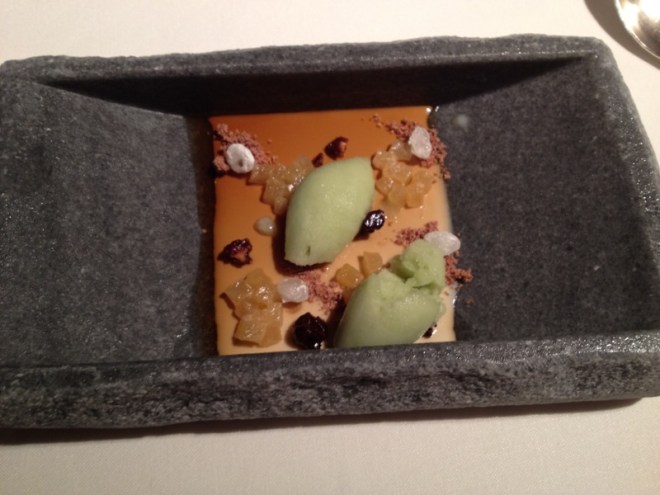 Finalmente, terminamos los platos principales con un hígado de paloma torcaz en forma de una fina cremita depositada en el fondo del plato, acompañado por un jirón de pechuga tan cocinado a baja temperatura que su color, en toda su extensión, sugería mucho el de la perfecta carne cruda.