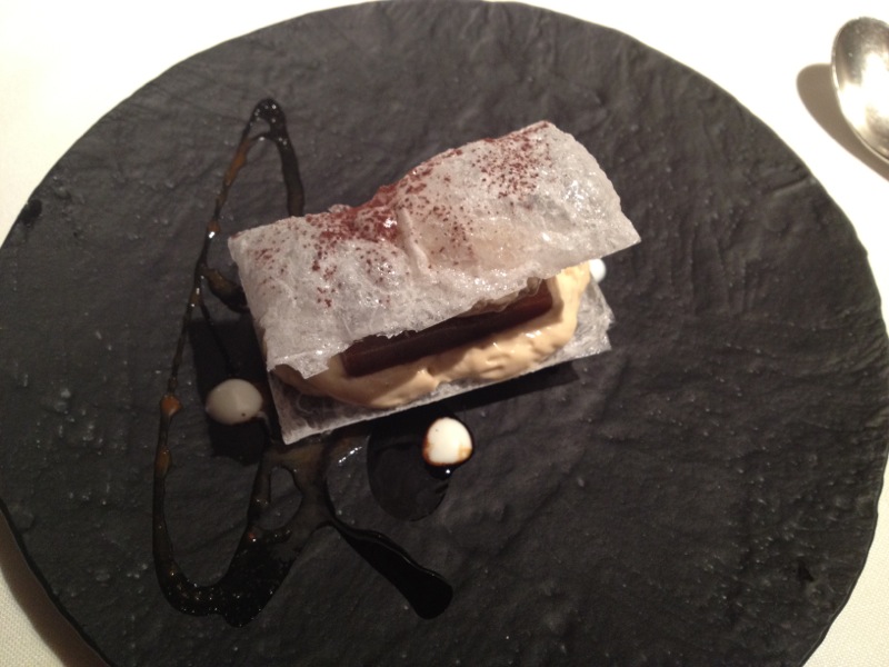 Los postres, una crema de arce, una manzana de caramelo y un milhojas de moca, que podían haber atenuado nuestra decepcionada impresión tampoco nos parecieron sobresalientes, aunque eran muy vistosos y originales…